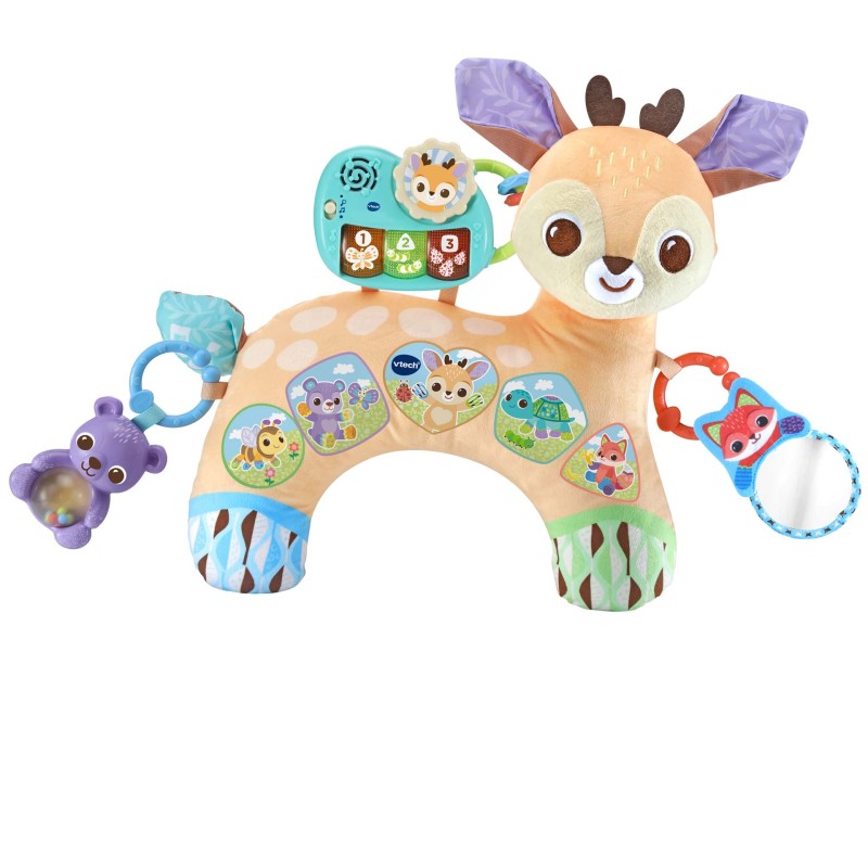 Cojín para bebés +3 meses, explora cuatro etapas del desarrollo de juego (tumbado, sentado, de paseo y juego independiente) ¡Explora y crece con la cervatilla! ¡Pásalo en grande con esta simpática cervatilla! Fomenta el juego tumbado con texturas suaves y un espejo donde al bebé le encantará mirarse.
