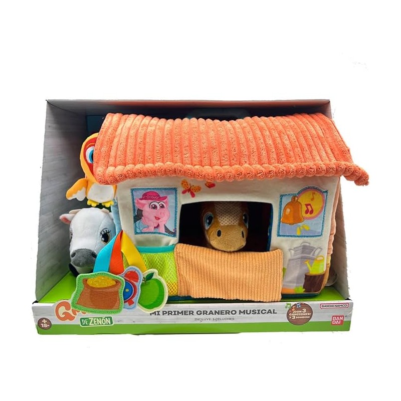 Incluye 3 mini peluches de la serie La Granja de Zenón; vaca Lola, Gallo Bartolito y Caballo Percheron