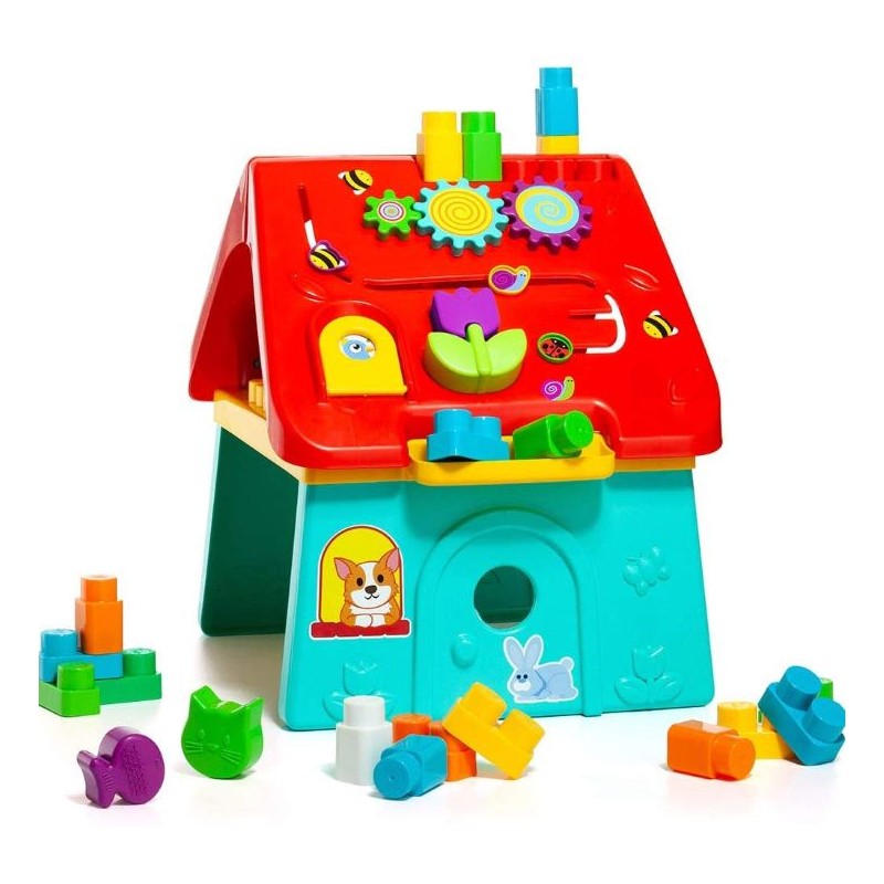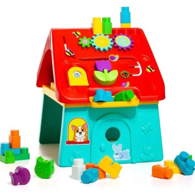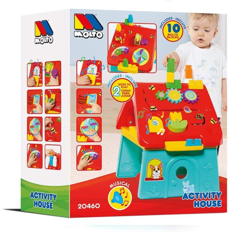 Juguete educativo con forma de casa. Se trata de un centro de actividades musical con dos caras, por una un puzzle flor de dos piezas, una ventana musical, juegos de coordinación y motricidad y espacio para construir el final de la casa con los bloques Molto y en la otra, un juego de numeros, una chimenea para construir, una ventana para encajar el pez y el gato que incluye como accesorios y un molino para darle vueltas y vueltas sin parar. Cuando termines de jugar podras guardar los puzzles dentro de la casa. Gran estabilidad. Incluye 10 bloques, 1 pez, 1 de gato y 1 flor puzzle de dos piezas.