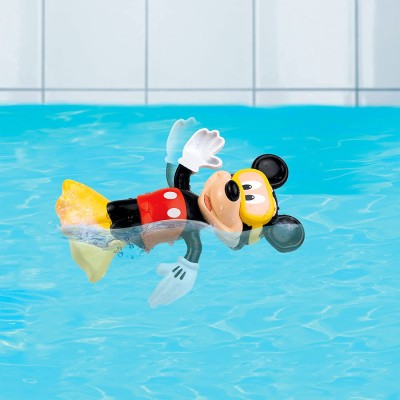 Este muñeco de Mickey está vestido con un completo traje de nadador que consta de unas aletas amarillas y unas gafas de buceo a juego