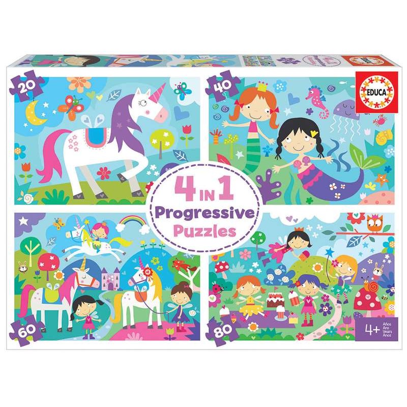 Cada caja contiene 4 puzzles con diferente número de piezas (entre 20 y 80), para que niños y niñas se atrevan con distintos niveles de dificultad a medida que crecen y ganan práctica en el montaje. Tamaño aproximado de cada puzzle montado: 28 x 20 cm. Temática: hadas, unicornios y sirenas.