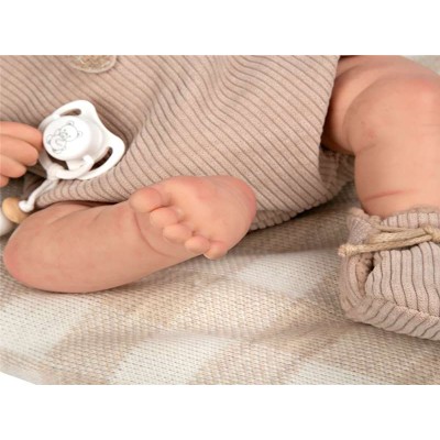 La carita del pequeño Rubén es tierna y expresiva. A este bebé le encanta jugar, pero lo que más le gusta es dormir plácidamente arropado en su mantita. Este bebé realista tiene extremidades de vinyl y cuerpo blando relleno de bolitas para aportarle estabilidad y peso. Su cabeza, brazos y piernas de vinyl permiten proporcionarle detalles tales como rojeces o venitas. El diseño de su ropita en tonos beige es muy actual y para su confección se han utilizado tejidos de alta calidad. Como accesorios incluye: un cojín, chupete, chupetero, pañal, libro de familia y certificado de autenticidad.