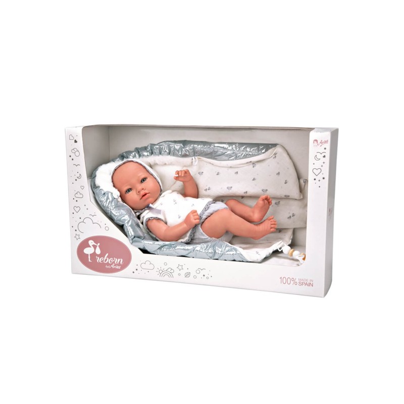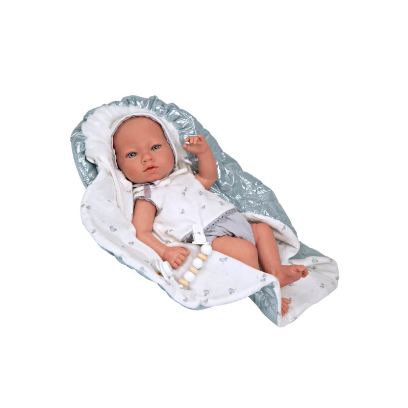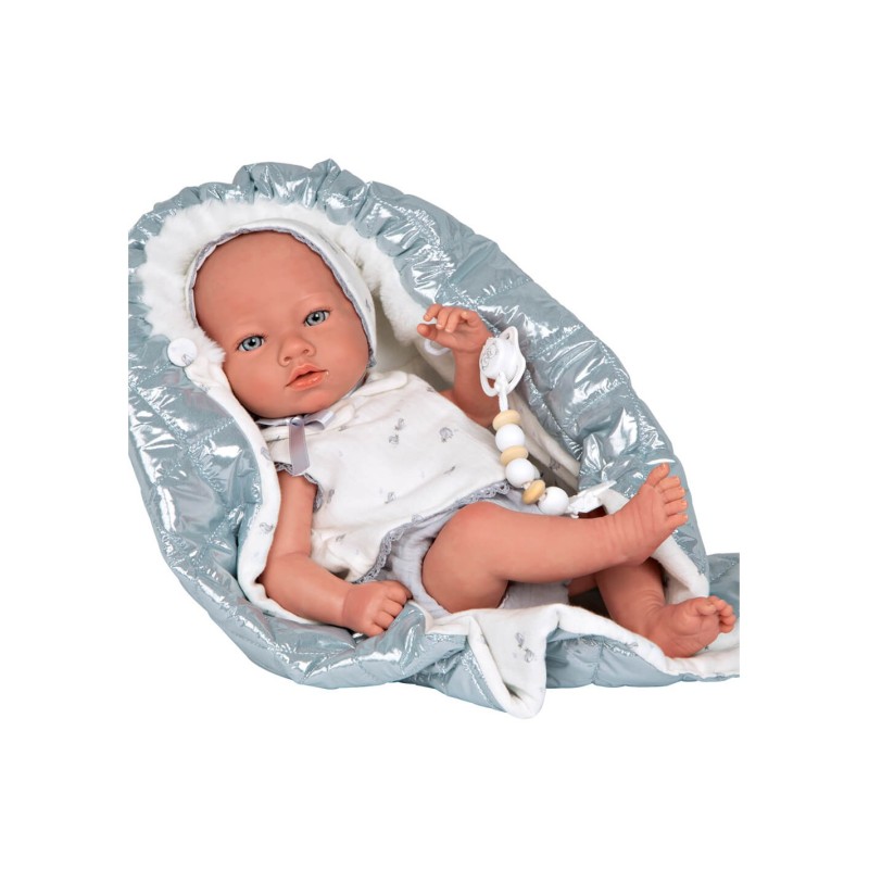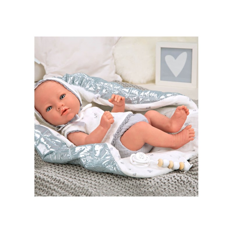 El pequeño Borja mira muy atento esperando a compartir sus mejores momentos contigo. Este bebé tiene cuerpo y extremidades de vinyl. Se han empleado materiales de alta calidad para conseguir su tacto suave y su peso. Su cuerpo de vinyl permite aplicarle detalles muy realistas como piel sonrosada, babita, venitas y decoración de las uñas. Su ropita y mantita en tonos azules, blancos y brillo se ha confeccionado con tejidos de alta calidad cuidando al máximo cada detalle de su diseño. Como accesorios incluye manta, chupete, chupetero, pañal, libro de familia y certificado de autenticidad.