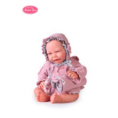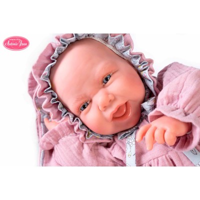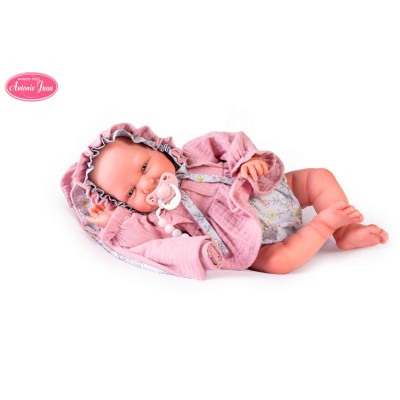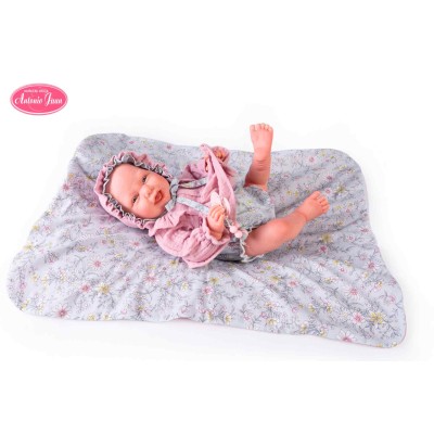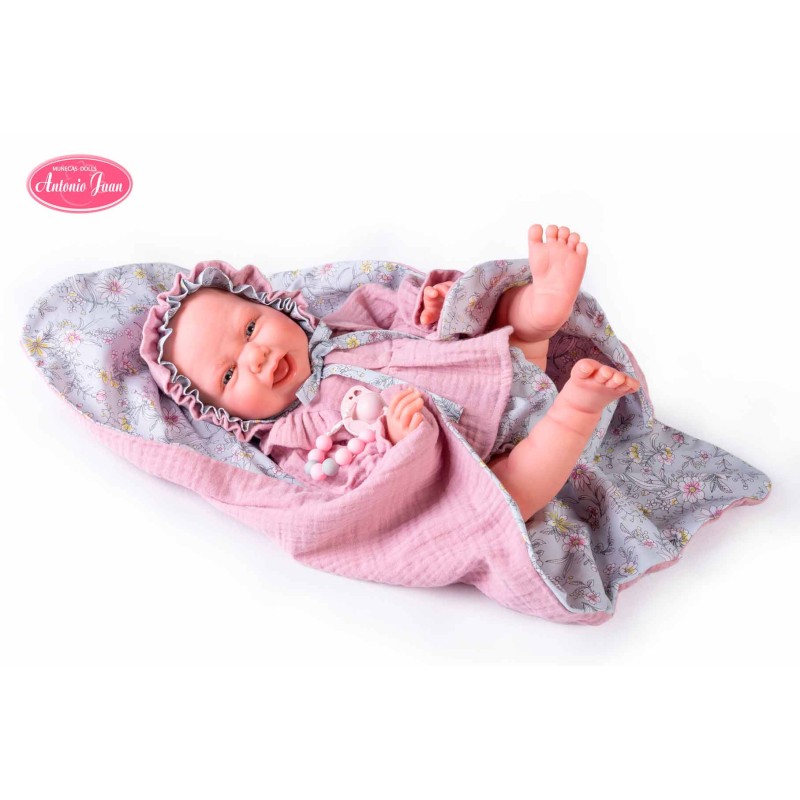 Sweet Reborn Carla con mantita y capota, es como un auténtico bebé, con todas las características propias de un bebé de verdad: su piel sonrosada y suave, sus venitas, la manicura… Todo realizado a mano, para que sea un bebé como tú. Tiene el cuerpo de tela blandito para que le puedas dar suaves abrazos. Carla con mantita y capota está ya preparada para ir de paseo contigo, con su camisa y culotte a juego de su mantita en colores rosa y de florecitas. Su graciosa capota con volantes le hace una carita preciosa. Su ropa está confeccionada con tejidos "Organic Cotton", lo que significa que en su cultivo y en su proceso de producción no se han utilizado productos químicos, solo naturales. Además lleva un pañal como un bebé de verdad. Puede colocarse en muchas posiciones como un bebé real porque sus extremidades giran, tiene movimiento, lo que le hace tener más realismo. Pesa 1340 gr. y mide 42 cm. ¡Y viene acompañado de su certificado de autenticidad, con una numeración única que garantiza su exclusividad como Reborn de Muñecas Antonio Juan!
