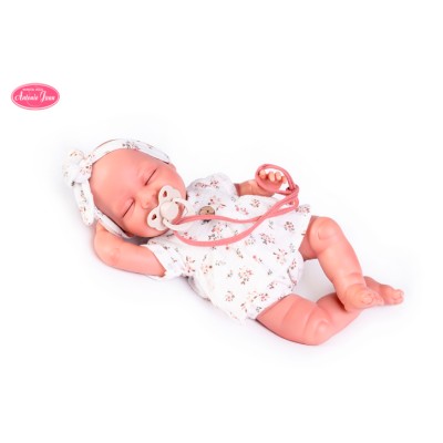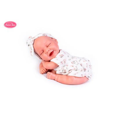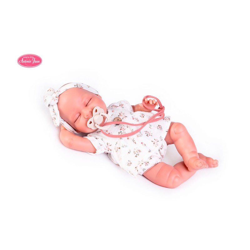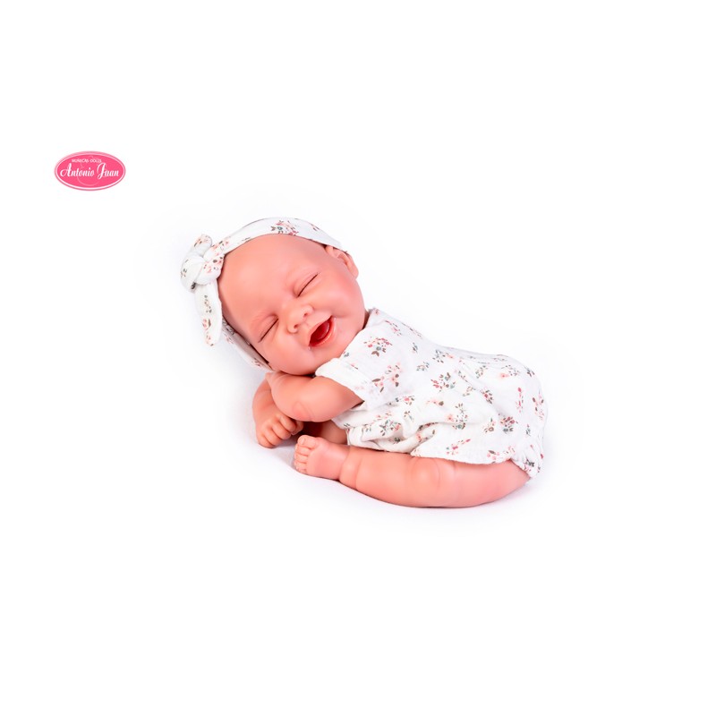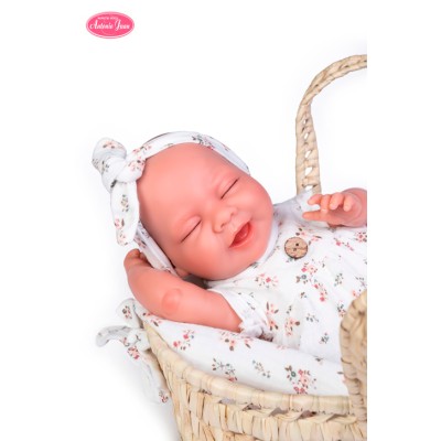 Mi Pequeño Reborn es la nueva familia de Reborn de Muñecas Antonio Juan. Este pequeñín gana en realismo y ternura en cada detalle para que disfrutes del apasionante mundo de los Reborns. Lluna está descansando en su capazo de palma y parece que tiene unos sueños muy dulces porque no para de sonreir. Lleva un bonito vestido de flores, a juego con el estampado de su capazo y su diadema con lazo. Puede colocarse en muchas posiciones como un bebé real porque sus extremidades giran, tiene movimiento, lo que le hace tener más realismo. Lleva un chupete para que pueda relajarse al dormir. Pesa 814 gr. y mide 33 cm. Incluye un libro de familia para tu Reborn.