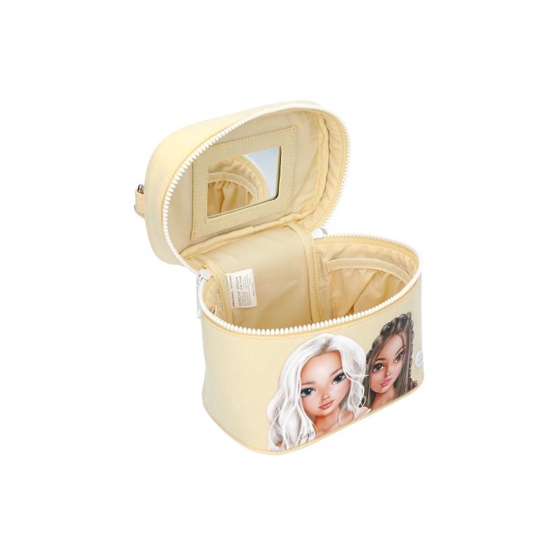Genial, brillante, amarillo: El neceser de TOPModel está revestido por completo con material brillante y lleva en la cara delantera un maravilloso motivo de dos modelos. Con asa superior de cordón en tono a juego, así como un colorido colgante de cadena con un donut pequeño y un cucurucho de peluche. Práctico: interior con espejo y varios bolsillos. Material principal: poliéster 100 por 100.
