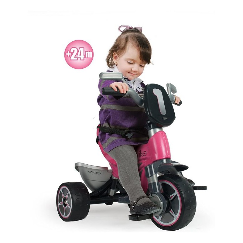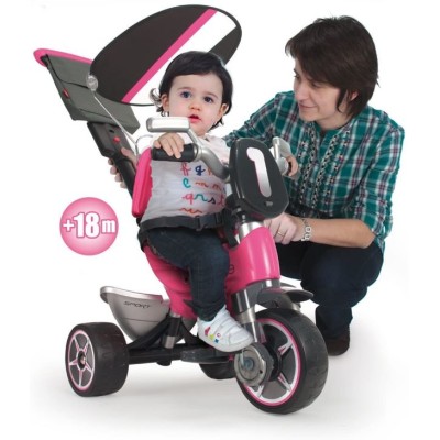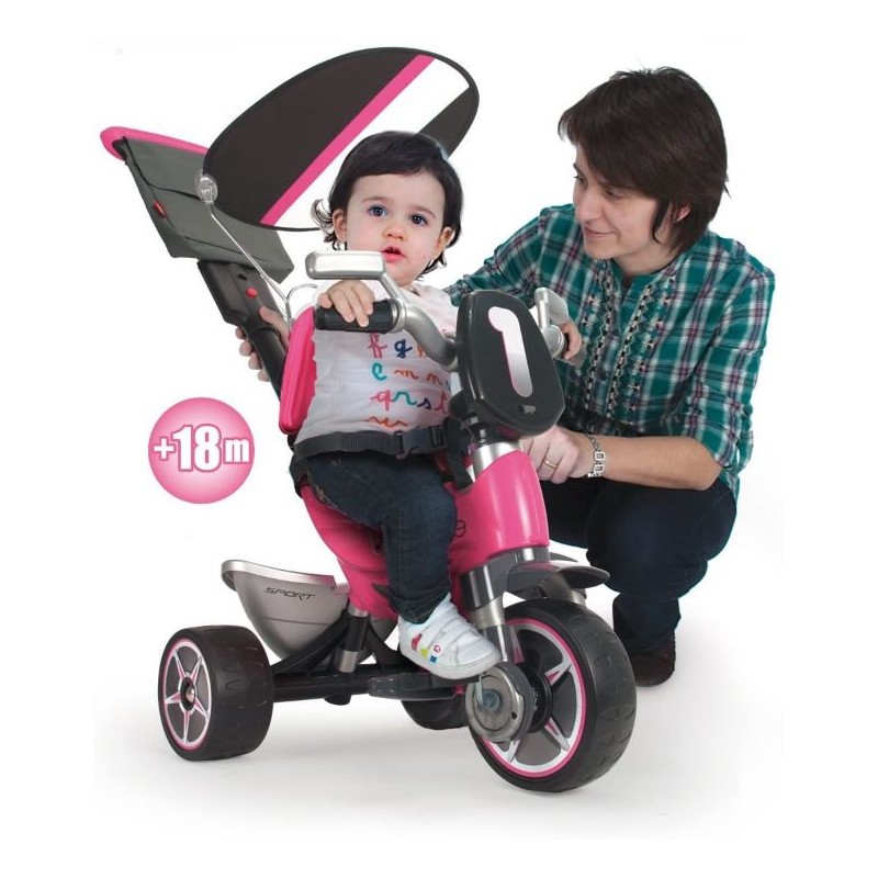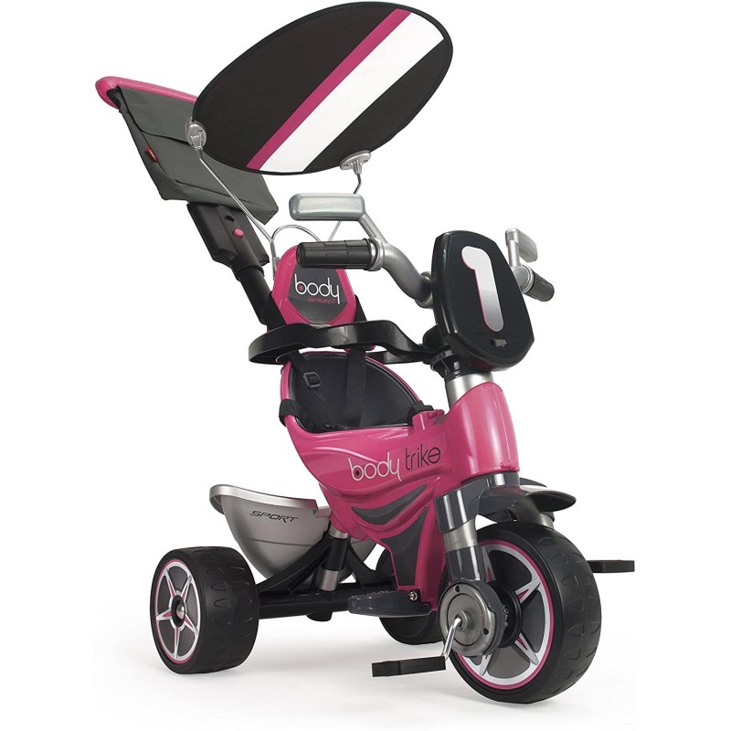 El triciclo evolutivo body sport de color rosa está recomendado para niños a partir de los 10 meses, es muy cómodo para los papás gracias al mango de control de dirección adaptable en altura, pero también para el niño puesto que cuenta con reposapiés abatibles, lleva cesta trasera amplia para que puedan transportar sus juguetes favoritos, e incluye cinturón de seguridad ajustable, mochila y parasol para la protección de los peques, está fabricado en españa y posee el certificado de seguridad en71.
