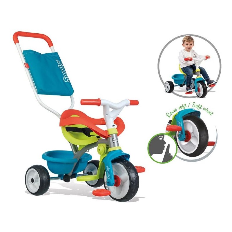 El triciclo azul Be Move Confort de Smoby está construido con sólido tubo de acero. Viene equipado con cinturón de seguridad y bloqueo de dirección. El sillín es regulable a 2 posiciones para acompañar al crecimiento del niño. La barra parental regulable permite a los padres controlar la velocidad y la dirección, y las ruedas de goma silenciosas permiten su uso dentro y fuera de casa. Sistema de rueda libre para evitar que los pedales golpeen los pies del niño cuando lo utiliza como correpasillos. Incorpora una mochila y aro de seguridad para asegurar la estabilidad del niño en el sillín. Dimensiones: 68 x 52 x 52 cm. Fabricado en España. Es un regalo óptimo para niños a partir de 10 meses, ya que mejora la coordinación de movimientos y favorece la orientación espacial.