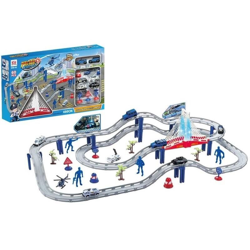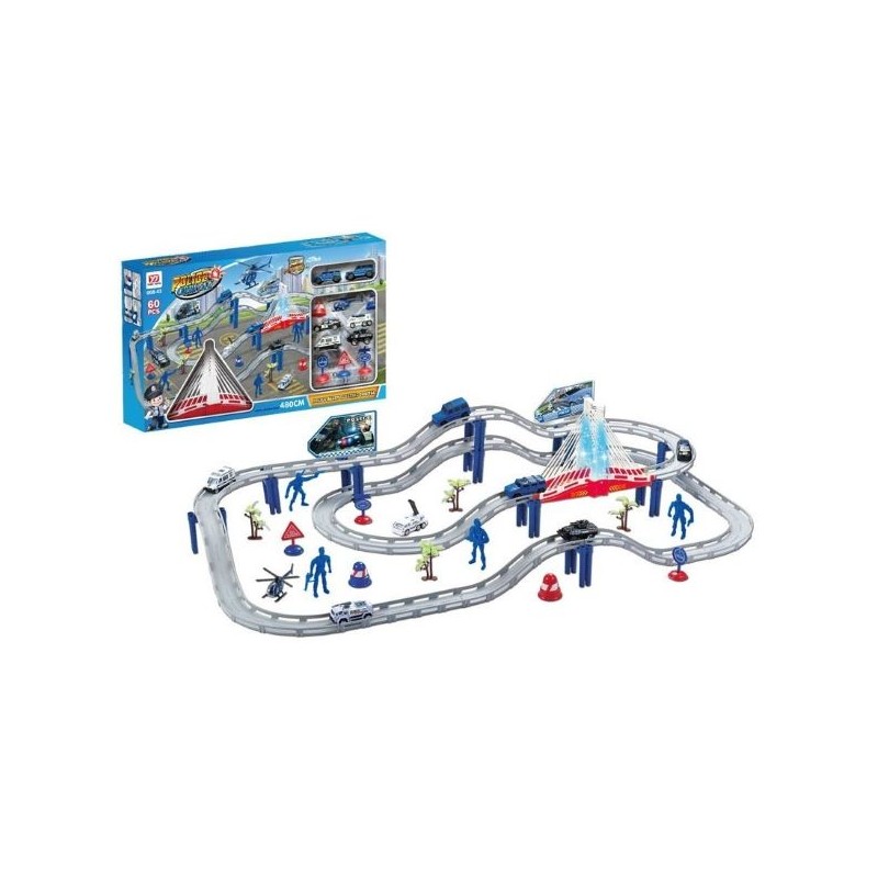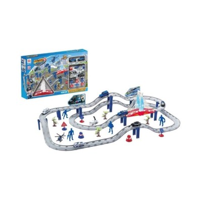 Monta la Pista de Carreras Infantil de Policía en casa y recórrela con os vehículos que incluye. Pasa por el puente de este circuito con los minicoches y juega con los muñecos de policía que incluye. También encontrarás varios decorados como vegetación y paneles publicitarios para ponerlos en el circuito. Una vez montado tiene unas dimensiones de 108 cm de largo y 56 cm de ancho.
