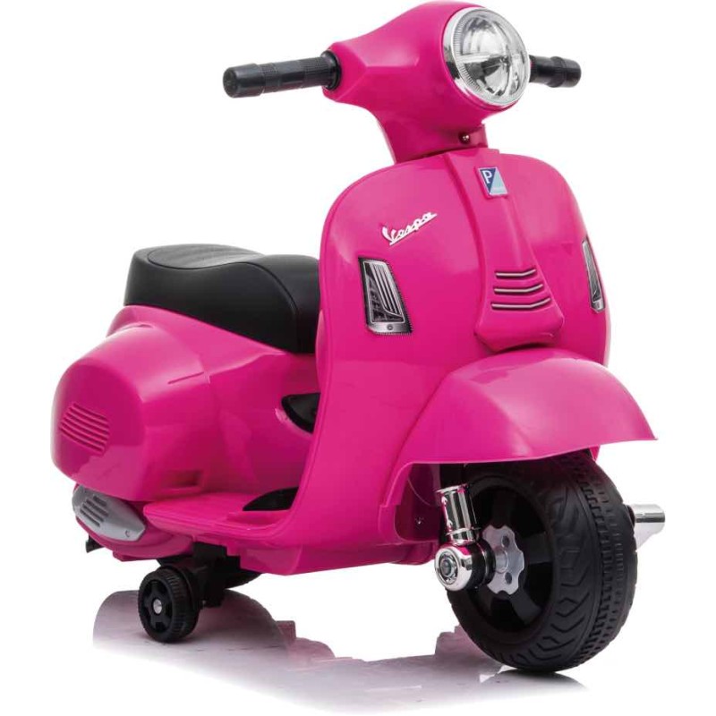 La Mini Moto de Batería Vespa Rosa tiene licencia oficial de Vespa, con la marca exclusiva de Motoor Kids. Se imaginarán que van viajando subidos a la moto por las carreteras de la toscana mientras ven el mar ¡Qué bonito!. Podrán tocar el Claxon y encender las luces. Además incluye una batería recargable de 6V, motor de 30W, 4AH, batería y cargador incluido. Puede llegar a alcanzar una velocidad máxima de 2,5 km/h. La Mini Moto de Batería Vespa Rosa mide aproximadamente 66,5cm x 38cm x 52cm ¡Run run!.