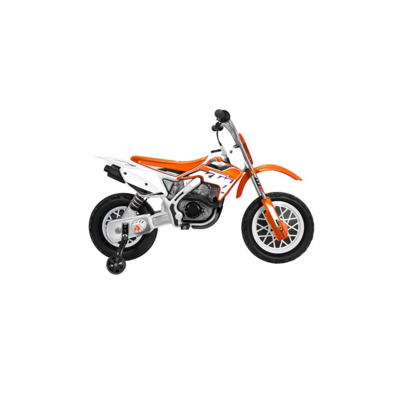 Moto Cross KTM de 12V con licencia oficial de marc a, recomendada a partir de los 3 años, color naran ja. Alcanza una velocidad de 5-6 km/h gracias al acele rador en puño y dispone de freno eléctrico, que pe rmite que la moto se frene cuando el niño deje de acelerar. Cuenta con ruedines estabilizado.