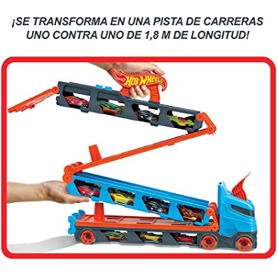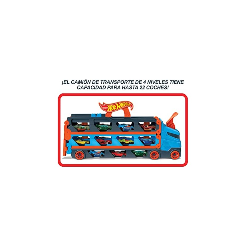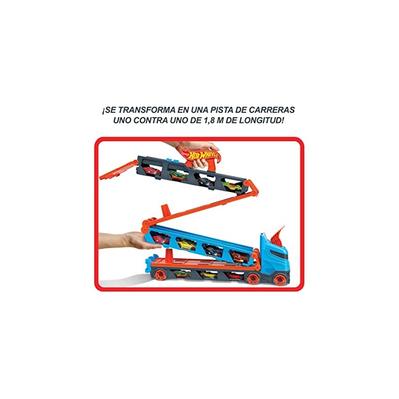 El enorme camión es perfecto para jugar con él de manera independiente, pero también sirve para almacenar hasta 25 vehículos (se venden por separado). El juguete 3 en 1 se transforma en una pista de carreras de más de 182 cm, con un lanzador doble para correr a tope.